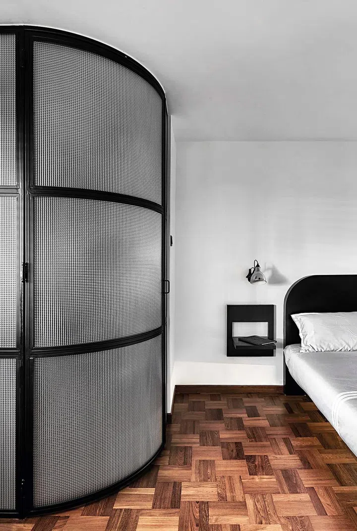 Inside is a tranquil haven for rest. Kelvin kept the original flat’s parquet flooring and installed a custom bed with a curved headboard and cantilevered base that allows a robot vacuum cleaner under it.