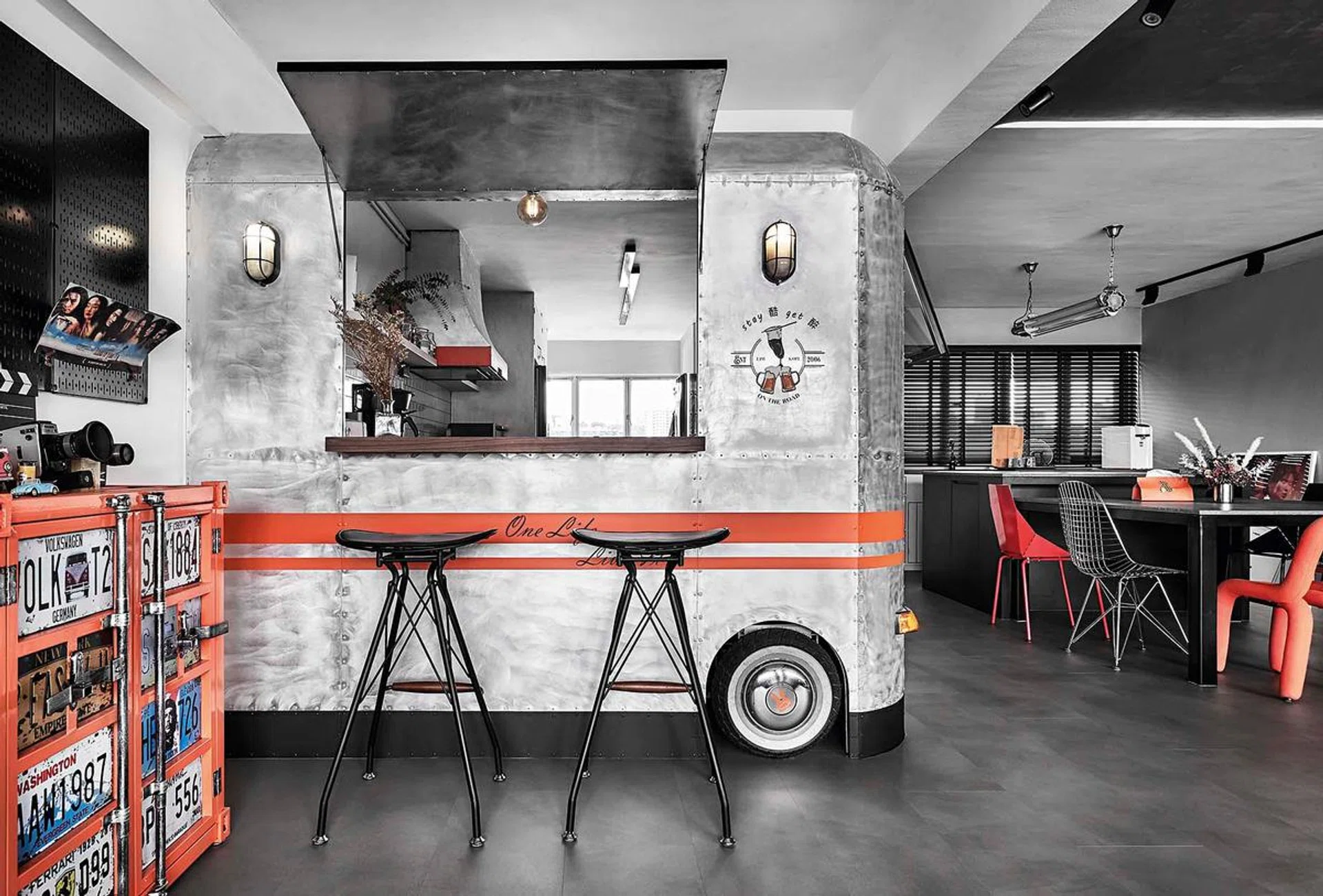 “It begins with Foong Hwee’s love for caravan,” shares Kelvin of the starting point of the design. “Then we decided to create a garage inspired interior.”