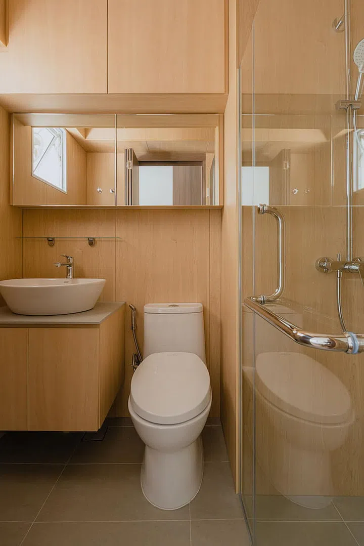 In order to achieve the same minimalist look in the bathroom, the team avoided using tiles as much as possible. They hid the bulky water pipes within cabinets, so that they remain easily accessible while hidden out of sight.