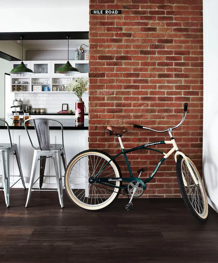 Exposed red-brick walls walls anchor the space, contrasting with the whitewashed cabinets, subway tiles, and black granite worktops.