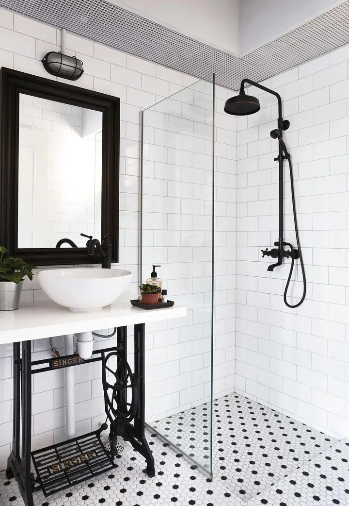 The legs of a Singer sewing machine support the vanity and sink in the bathroom...