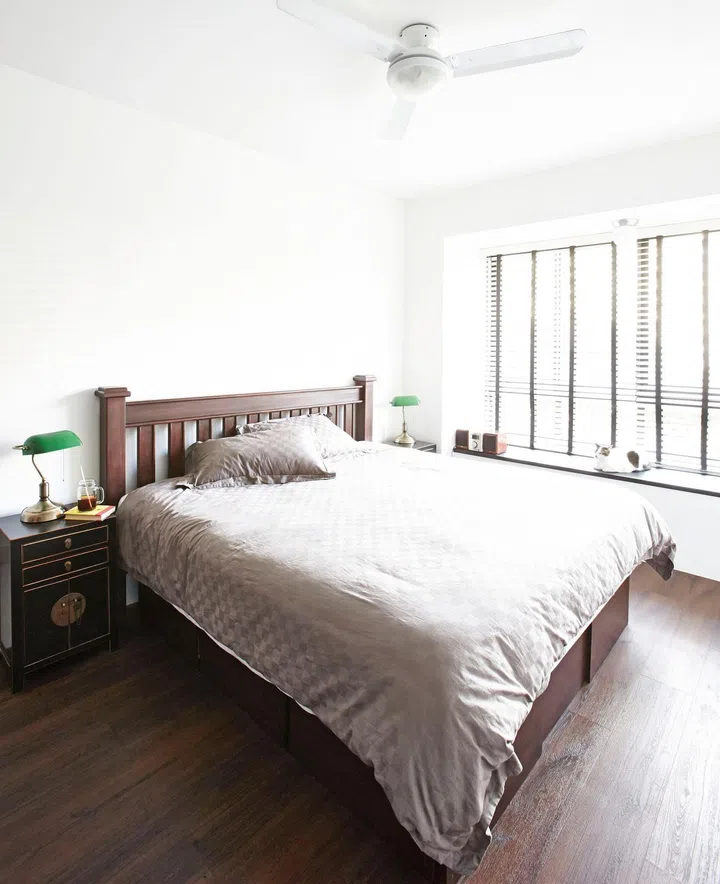 The simple master bedroom is free of adornments, save for Chinese antique-style side tables juxtaposed with retro lamps.