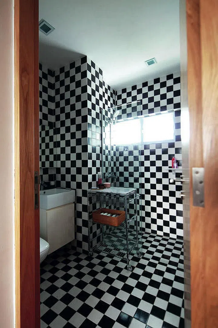 Jazzier than the rest of the home, the designer decked the walls and floors of the bathroom in the same chequered tiles.