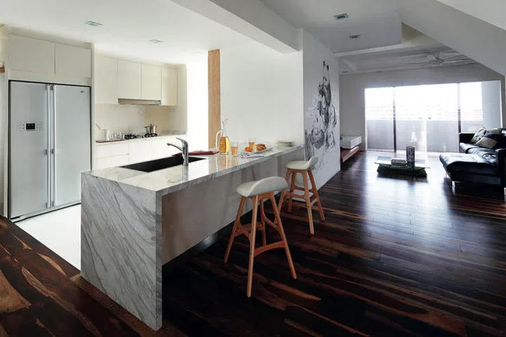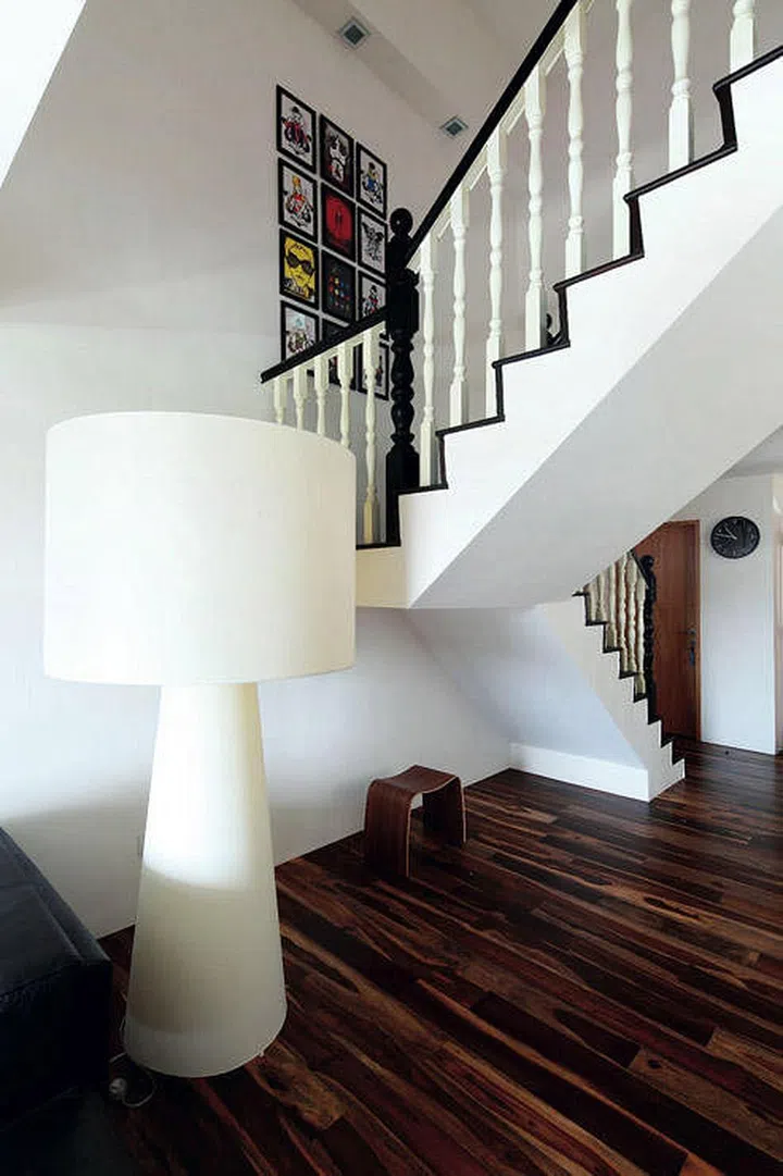 Interior design firm Mint Studio gave this HDB maisonette a clean and calm feel with its white palette and warm wood flooring.