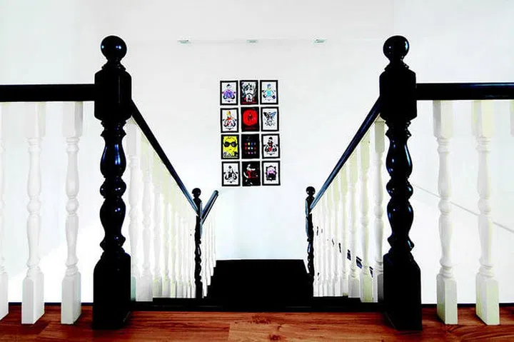 Placing photo frames at a height from the landing allows one to appreciate the images from the top of the stairs.