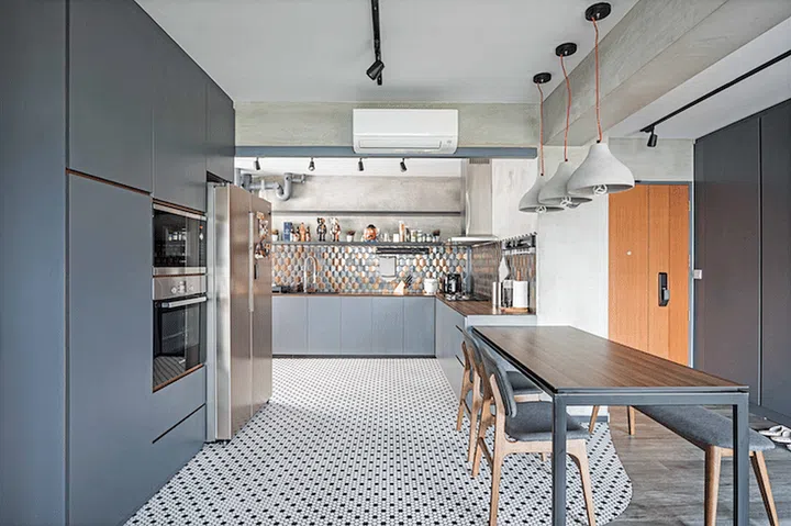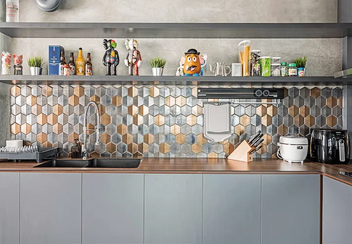At the dining area, black and white hexagonal tiles are used underfoot, while in the kitchen, gold and silver hexagonal tiles were chosen for the backsplash.