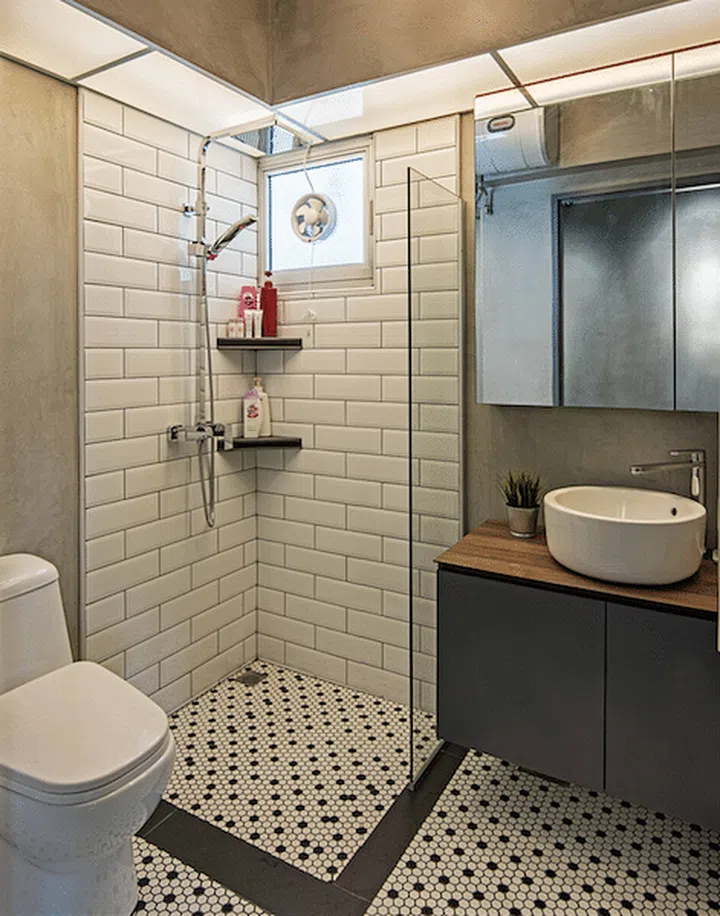 The grey and wood accents continue into the common bathroom, while subway tiles add textures here.