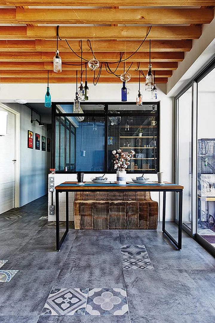 Taobao was the couple’s go-to place for decor items, such as the recycled glass bottle pendant lamps in the dining area.