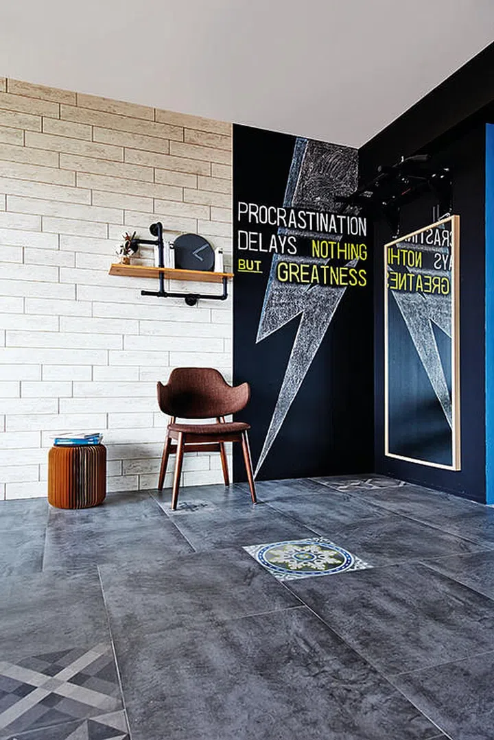 Patterned tiles were used with concrete-lookalike tiles, for a softer look. Walls painted with blackboard paint mark out the exercise area in the living room.