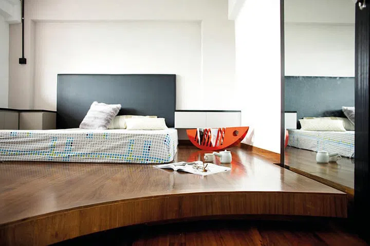 In the master bedroom, a thoughtfully designed curved platform elegantly accentuates the sleeping area, creating a sense of separation and sanctuary within the open space. The room’s industrial character is softened with a plush grey cushion from Molecule, while the distinctive Zuzu magazine rack from Lifestorey adds both functionality and sculptural interest. The serene corner is completed with a simple teapot and cup from Muji, offering a tranquil spot for morning rituals.