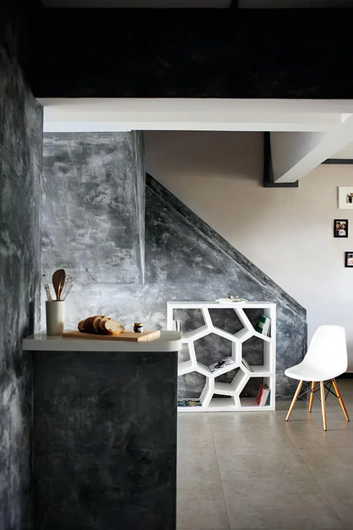 Complementing this multifunctional space is the striking Opus Incertum bookcase from Lifestorey, which provides both storage and visual interest. The minimalist tableware from Muji completes the setting with clean, simple lines that harmonize with the industrial surroundings.