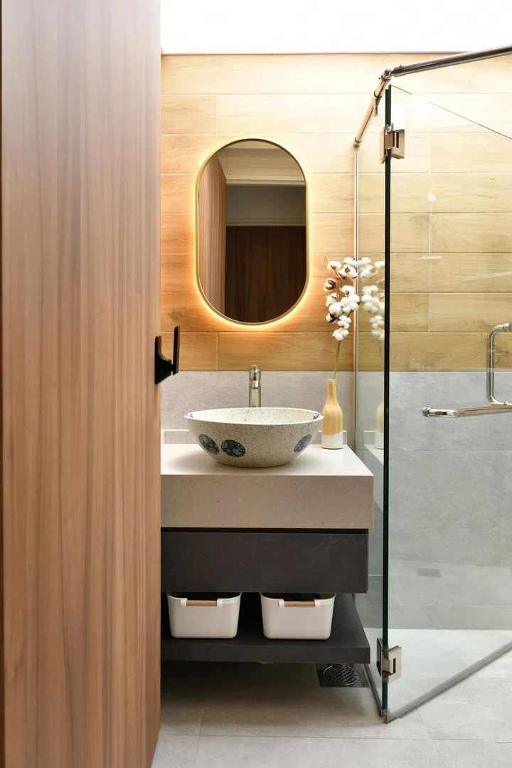 In the bathroom, Philip opted for a half-wall with warm wood laminate to draw the eye up and make the bathroom appear larger.