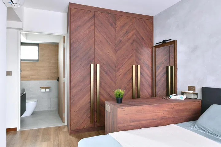 In the master bedroom, a dressing area is clearly demarcated in a corner of the room. Here, gold handles on the wardrobe doors pop against the dark grain of the wood, lending a touch of luxe.