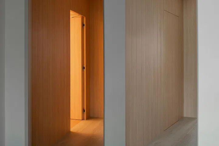 In the master bedroom, a concealed door in the feature wall opens up to reveal the walk-in wardrobe.