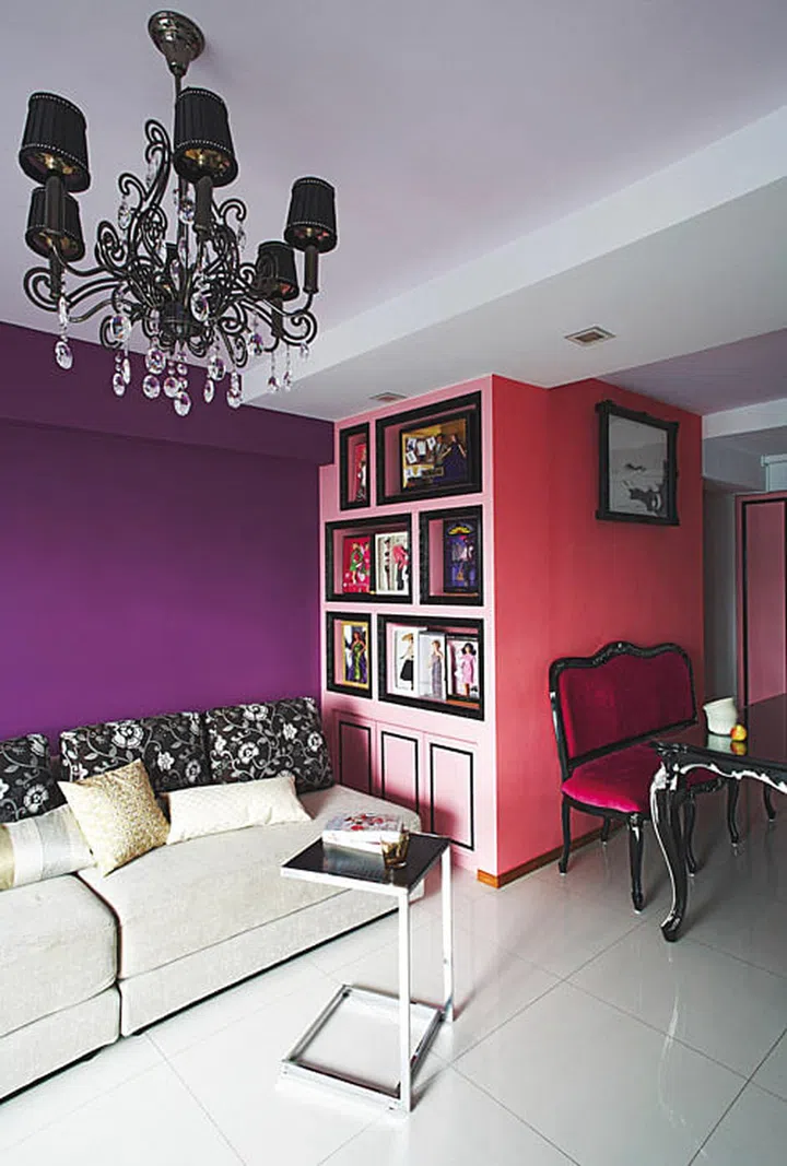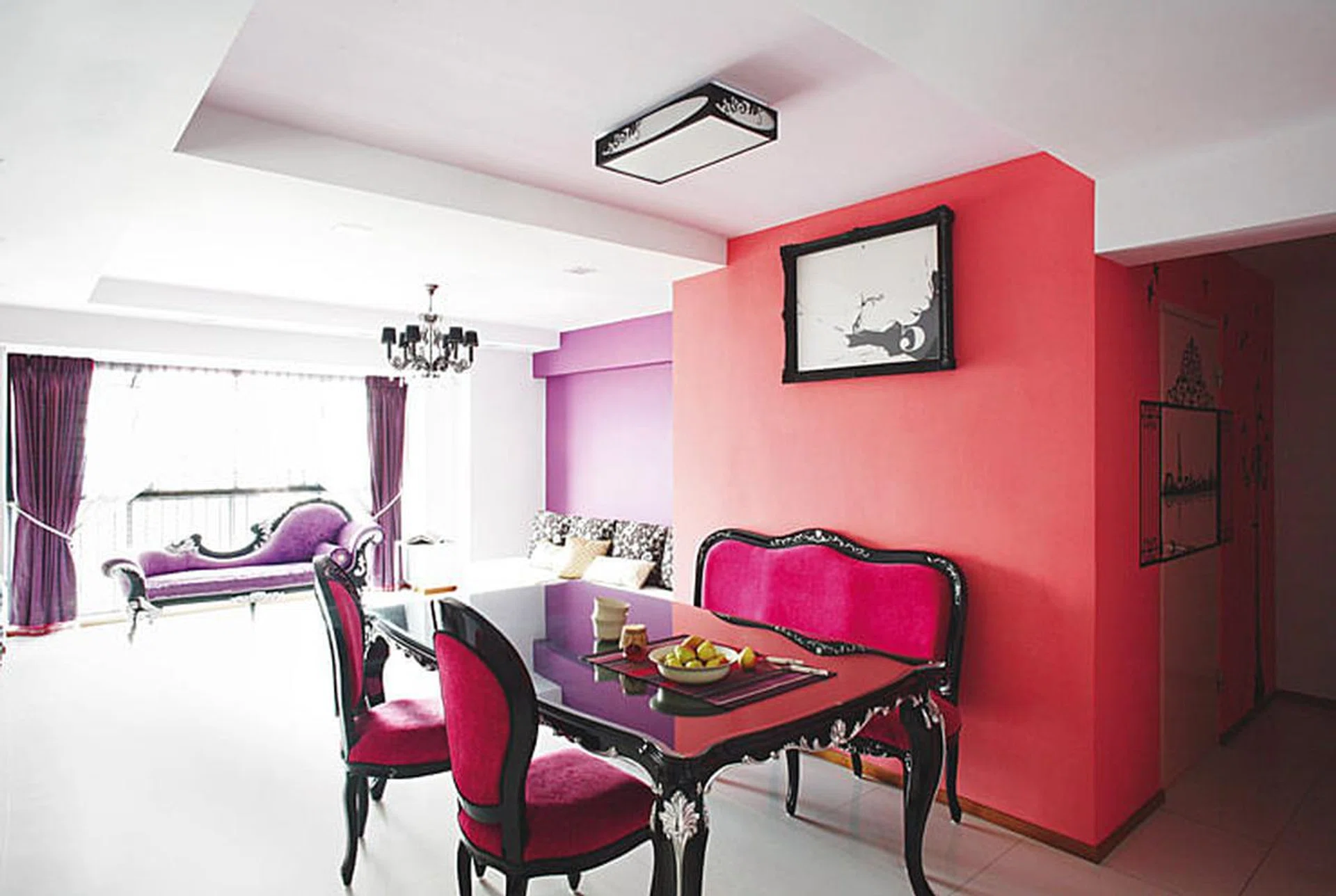What really makes this classical style HDB flat sing are the bold splashes of colour throughout. Flamingo pink and rich plum shades delineate the living and dining areas, adding an energetic punch.