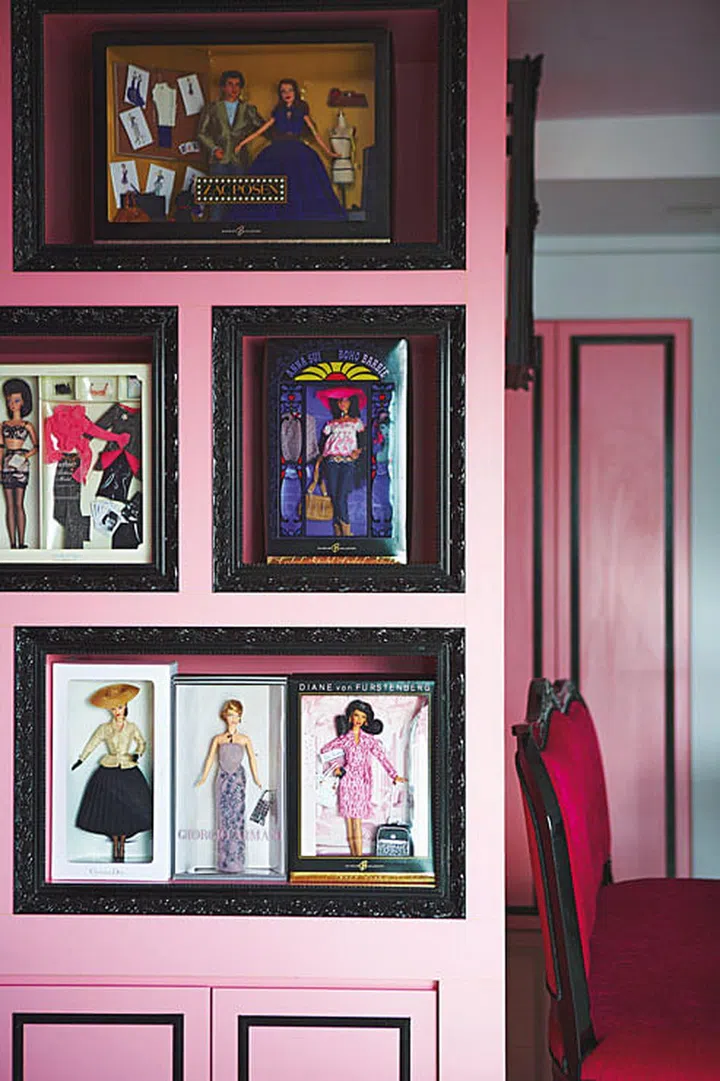 In the living room, the wife's collection of designer Barbie dolls doubles as smart storage for books and magazines while making for a fun conversation starter.