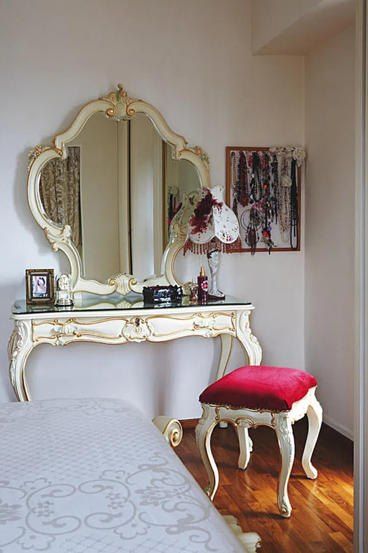 The master bedroom leans more towards traditional Baroque style with an ornate vanity set and headboard in elegant gold and ivory hues. However, red velvet stool upholstery maintain that signature injection of vivid colours. By combining classical architectural details like ornate furniture with modern elements like the black chandelier, this home achieves a delightful balanced look.