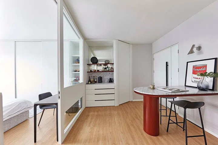 This isn’t the only space they can hang out in, though – the foyer has also been transformed into a miniature lounge with the addition of a peninsula counter and cocktail cabinet. Clad in marble and walnut, this lounge area is used as a standing bar where friends can enjoy a casual tipple before dinner.