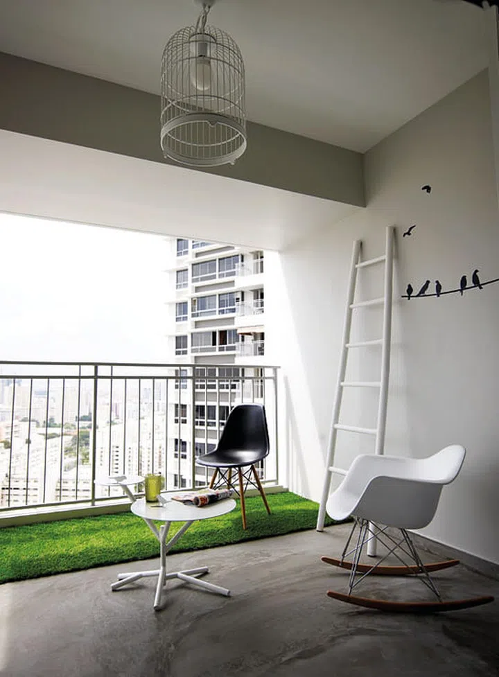 The bird motif and carpet grass liven up the stark background of the balcony.