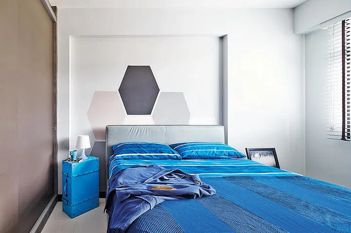 The blue elements provide a refreshing counterpoint to the predominantly grey and white palette, creating a balanced space that feels both cohesive with the rest of the HDB flat and distinct in its character.