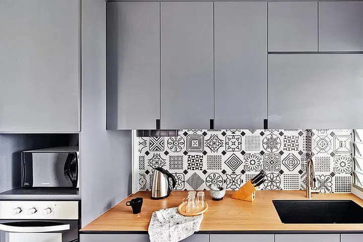 Patterned geometric tiles from Hafary, used for the backsplash, keep the design of the kitchen consistent with that of the rest of the home, and add a playful touch. In this culinary space, the restrained color palette continues, but the introduction of the wooden countertop prevents monotony.