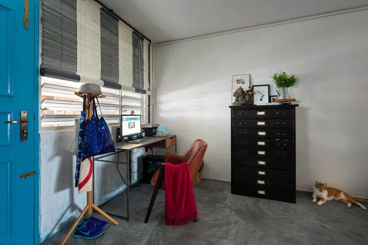In this unconventional three-room HDB resale apartment at Holland Avenue, total exposure is the name of the game – and it makes for a gritty statement in the form of raw textures and a stark monochromatic colour palette set against a bold blue on the floor and walls.