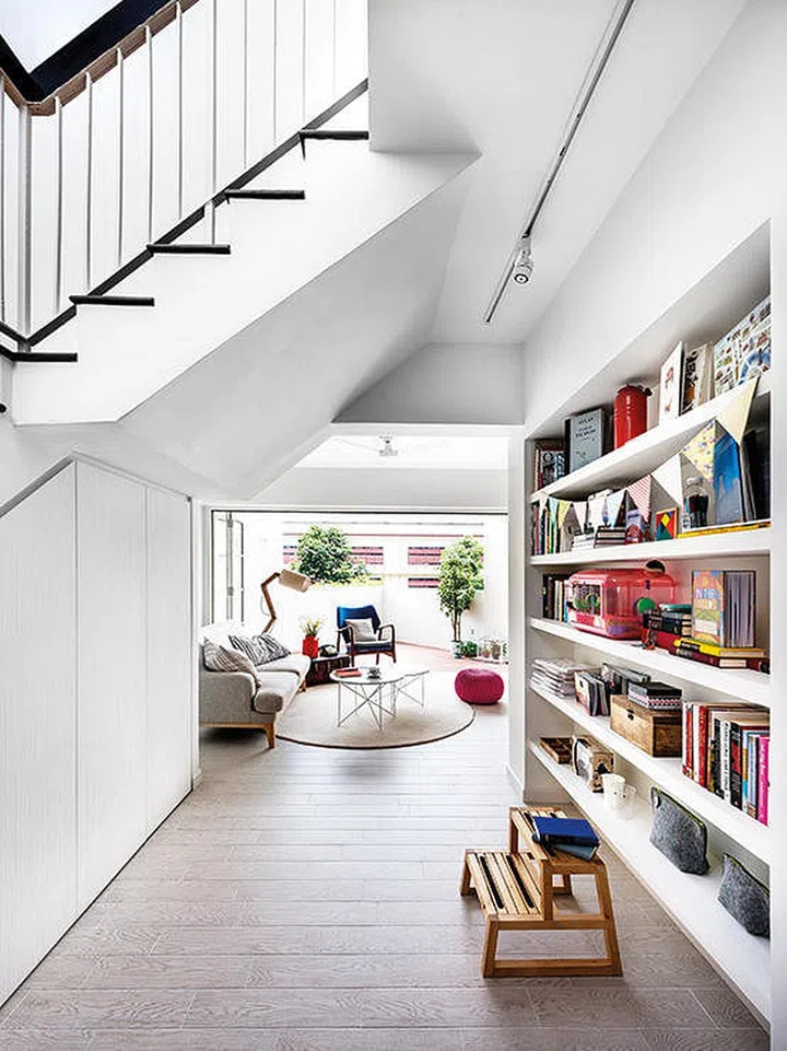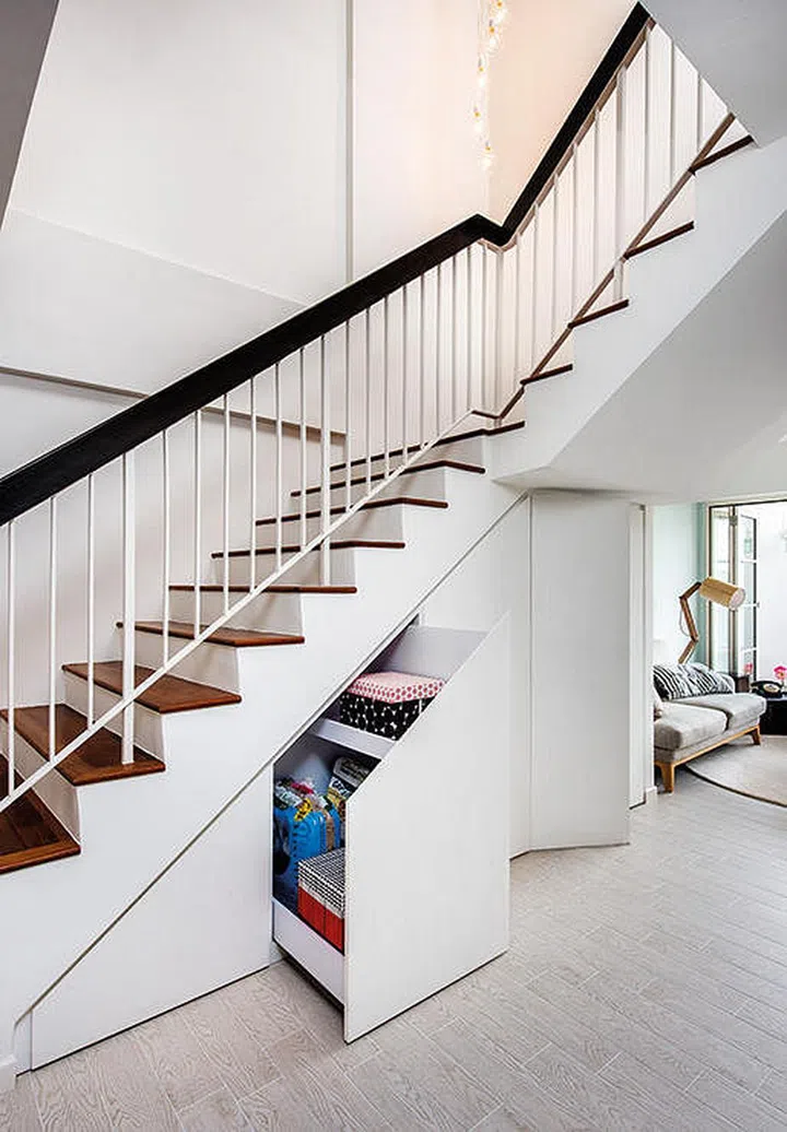 The irregularly-shaped space under the stairs did not deter the owners from turning it into a functional storage area.