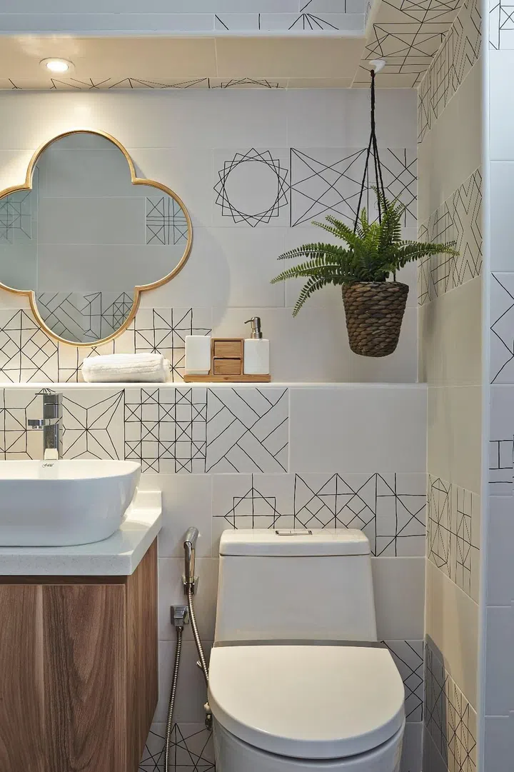 The common bathroom has a very interesting visual feature, thanks to geometric-patterned tiles and a uniquely shaped mirror.