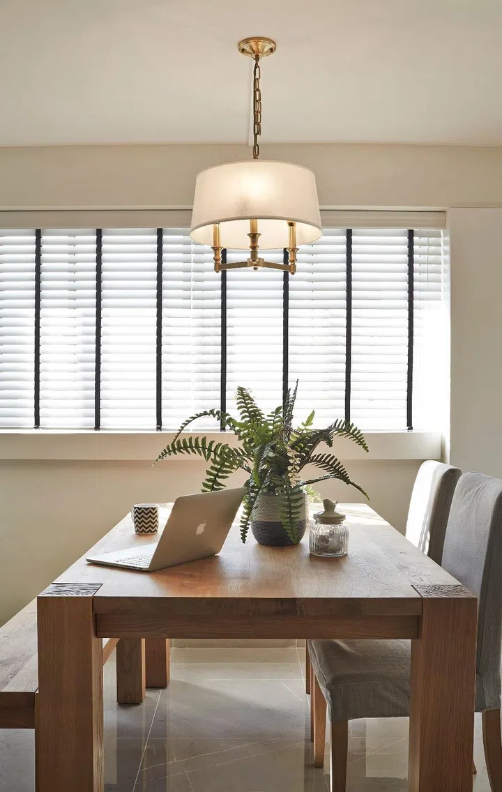 A palette of wood and grey fills the dining room, complete with a wooden dining table and grey dining chairs. The spaciousness here also adds a welcoming yet cosy ambience.