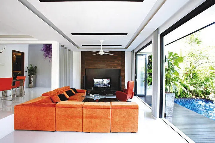 Orange and white form the colour palette for the ground floor. The sofa, stainless steel planters and several fur rugs were customised.