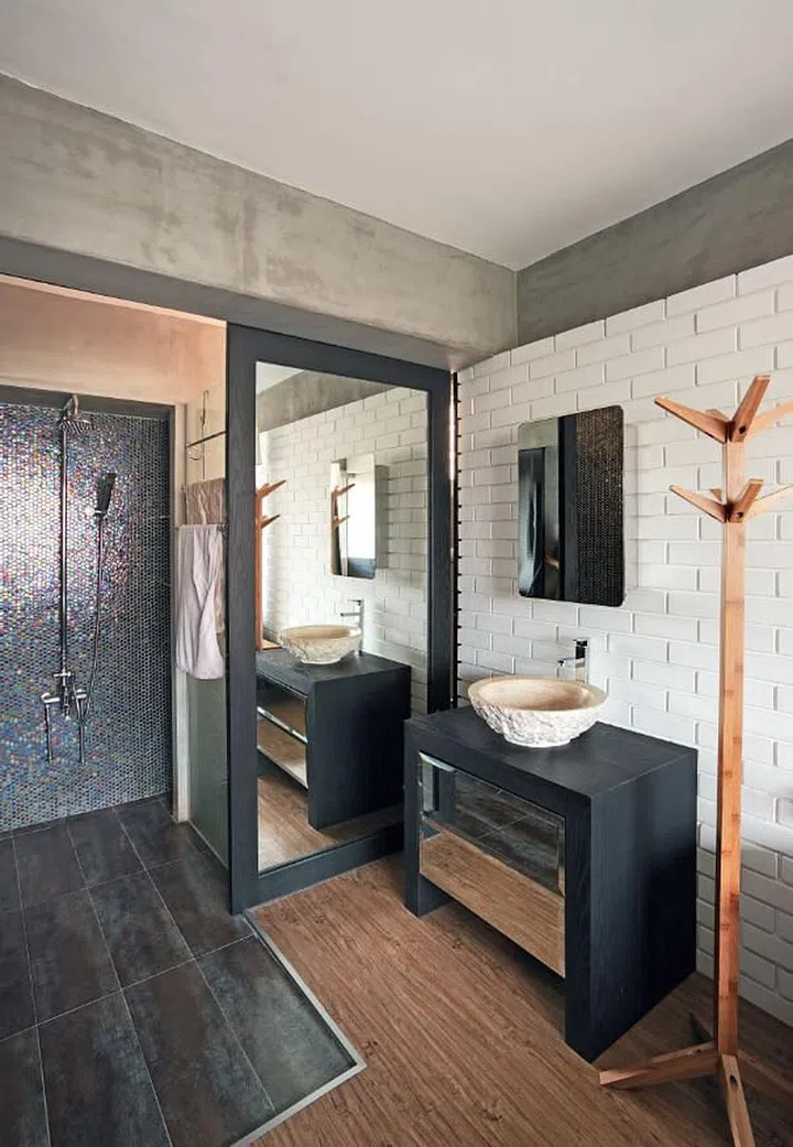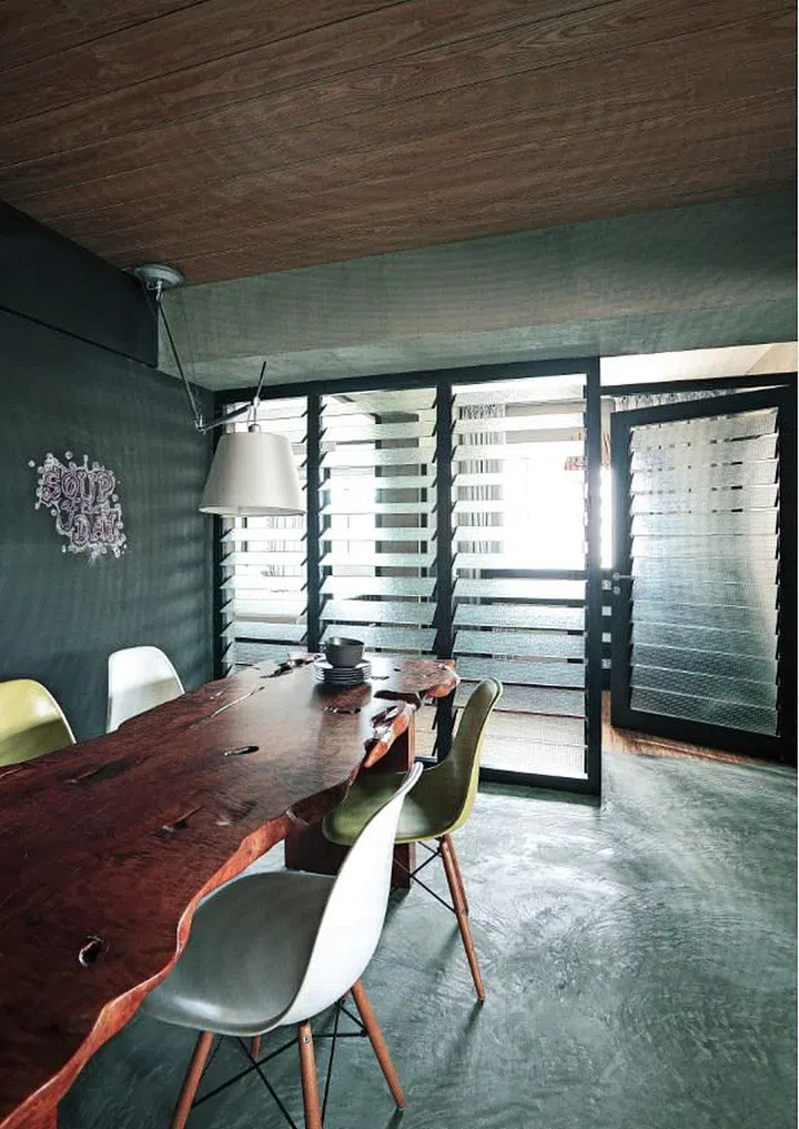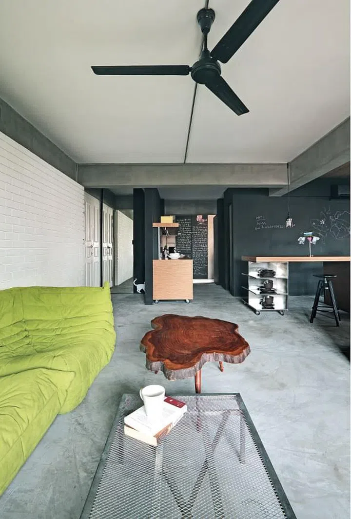 The interiors of this 1,300 sq ft (120 sqm) five-room HDB apartment in Telok Blangah reflect the spirited personalities of its homeowners – its raw concrete flooring, blackboard walls and bare wood surfaces are the canvas for vintage details and a touch of playfulness.