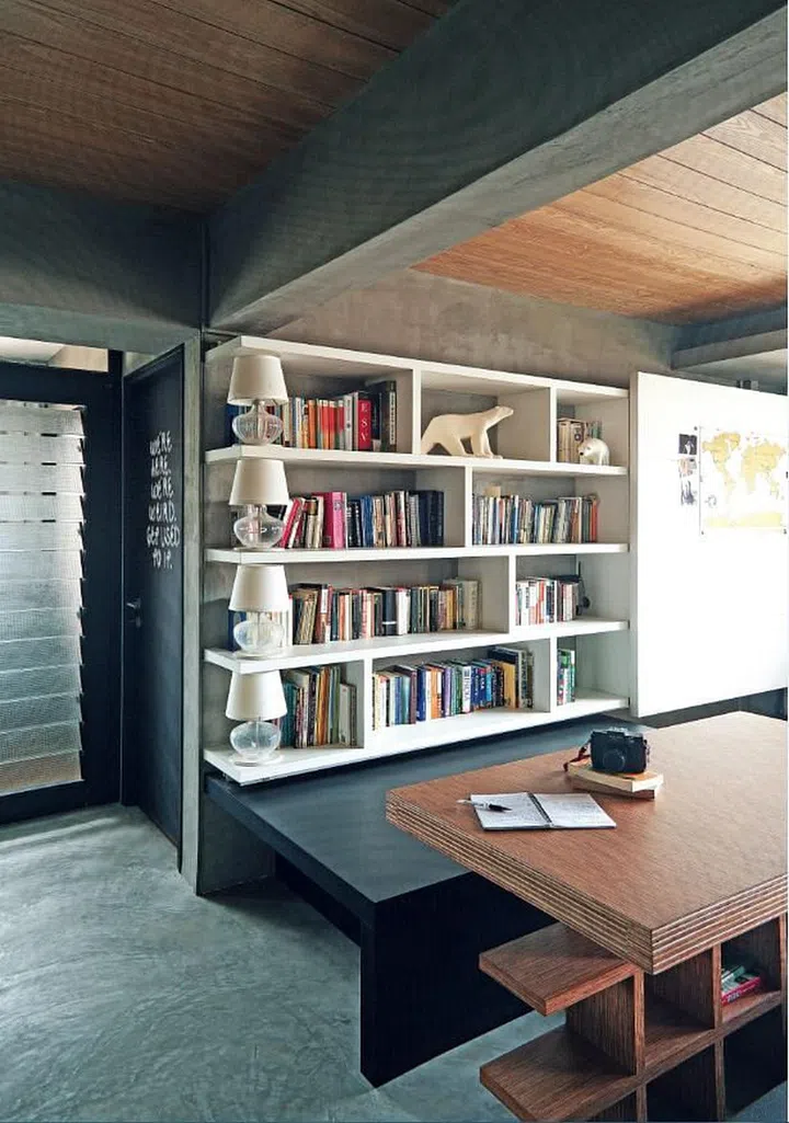 Louvred windows demarcate the space, allow diffused natural illumination into the room and lend vintage appeal.