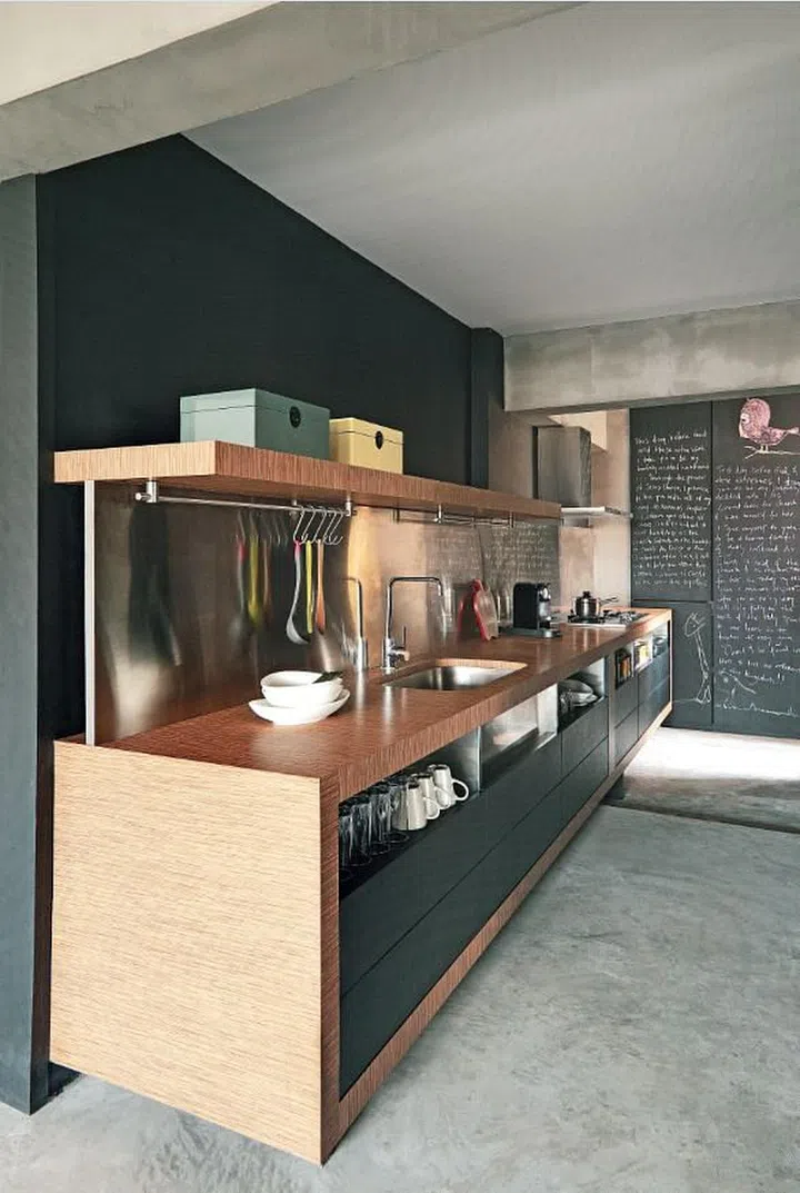 The kitchen countertop is clad in wood laminate and adds warmth to the space.