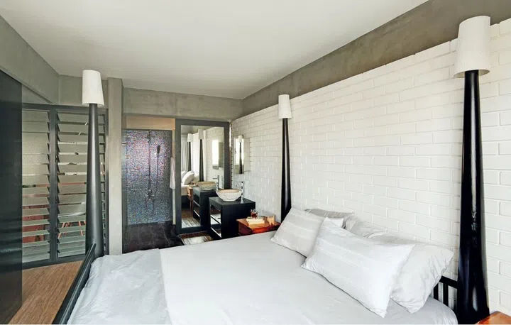 The bedroom's homely vibe is enhanced through its faux brick face wall; a touch of luxury is added through the shimmering mosaic wall in the shower area.