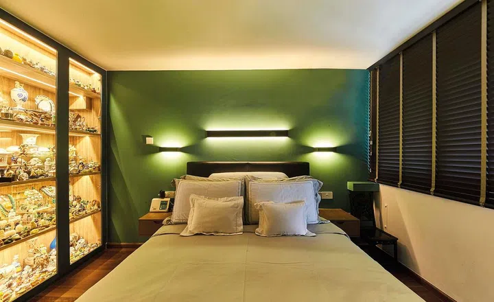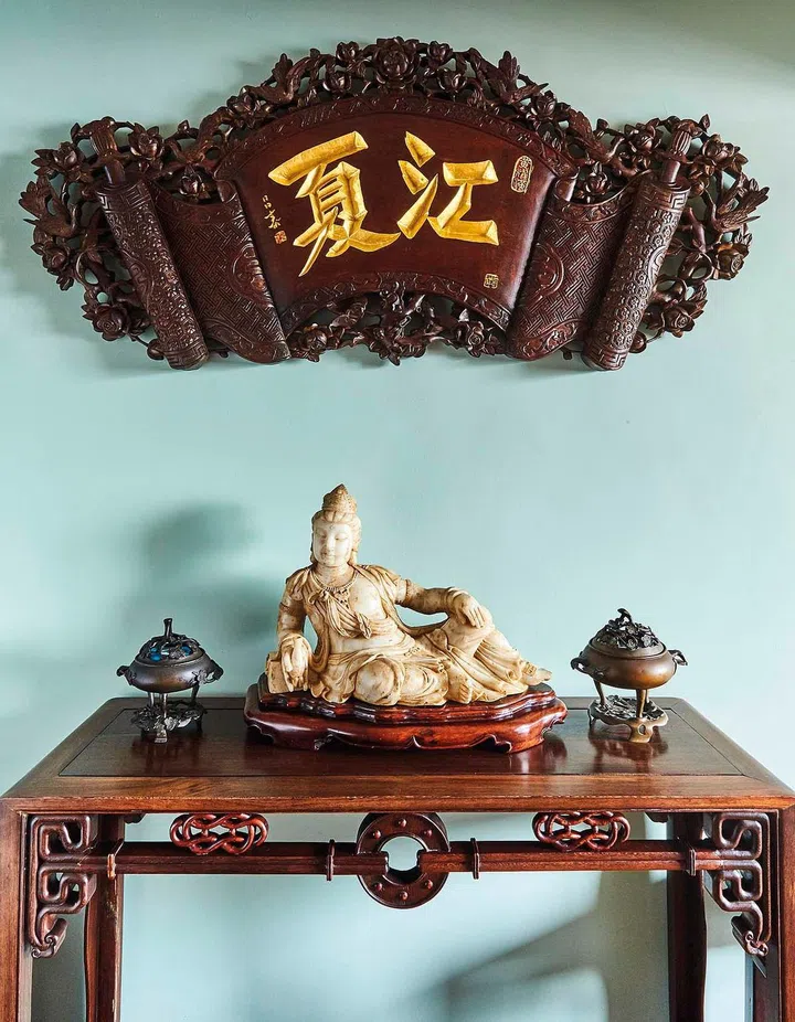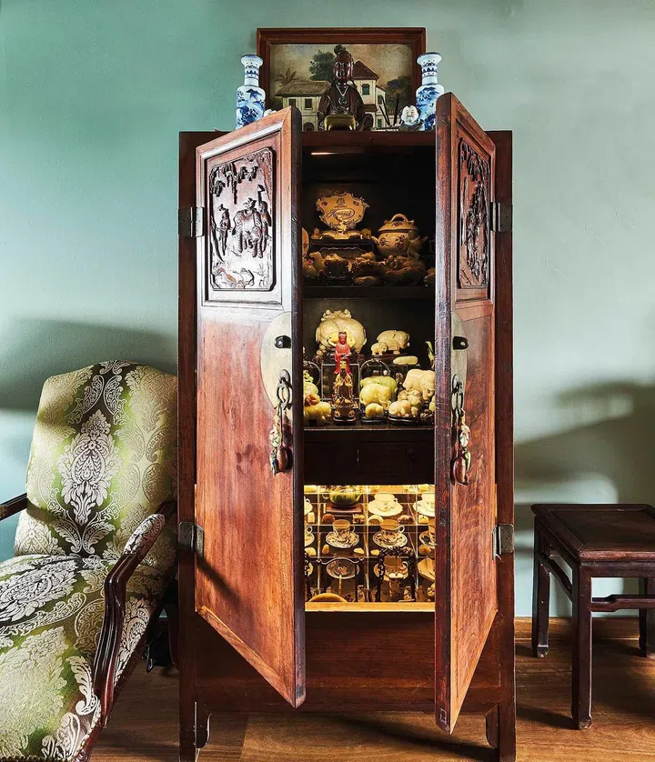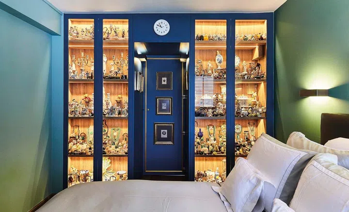 The glass-encased wall on the other side houses a sizable collection of knick-knacks from the pair’s travels. “This keeps all my clutters organised,” says the cousin.