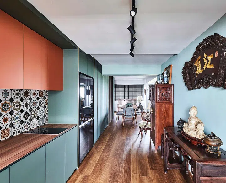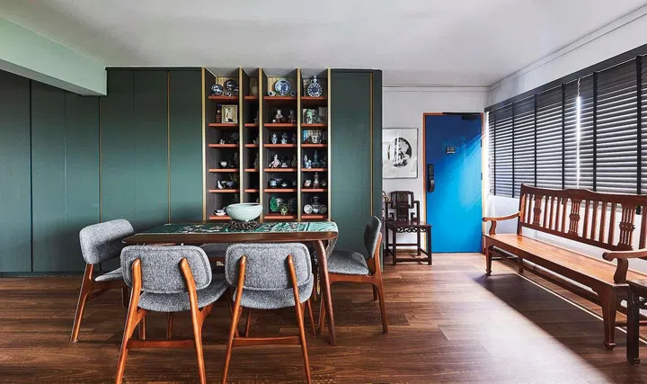 Solid cool colours, low-maintenance wood vinyl and Peranakan-inspired decorative tiles are paired with solid dark timber and brass. Antique and heirloom furniture exist harmoniously with modern iconic pieces and smart home elements.