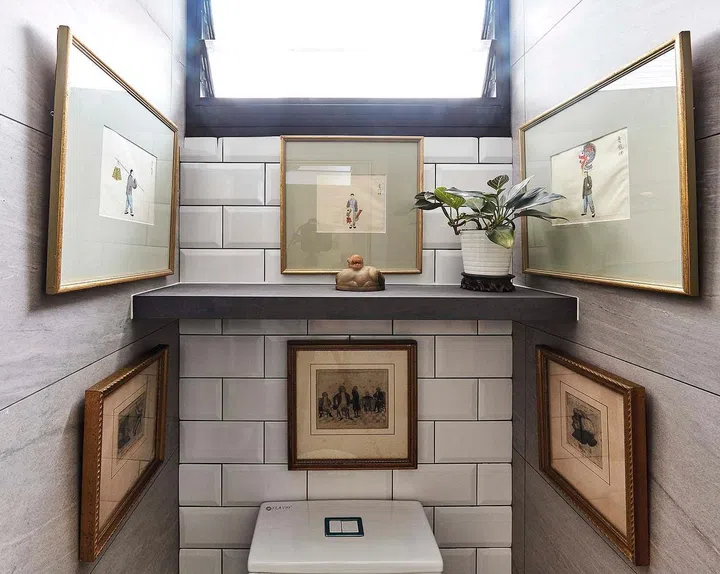 She also created an archway that frames the toilet area and decorated it with antique prints, turning it into a thinking sanctuary.