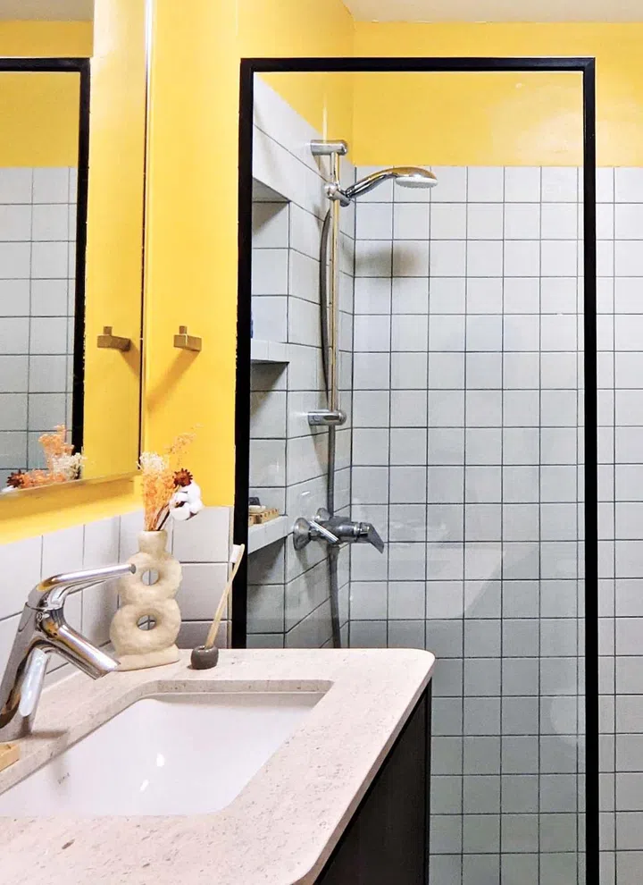 Notably, both homeowners are tall, so they elevated the vanity area for their daily comfort. A striking element is the splash of yellow that contrasts against the tiled areas.