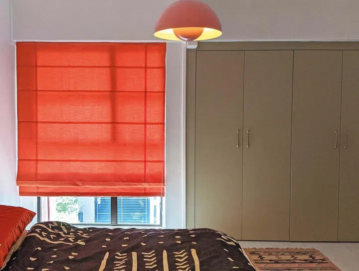 Instead of curtains, they went with a Roman blind in a shade of orange that complements the green wardrobe. Like the rest of the space, this bedroom also features statement lighting, which they purchased from Taobao.
