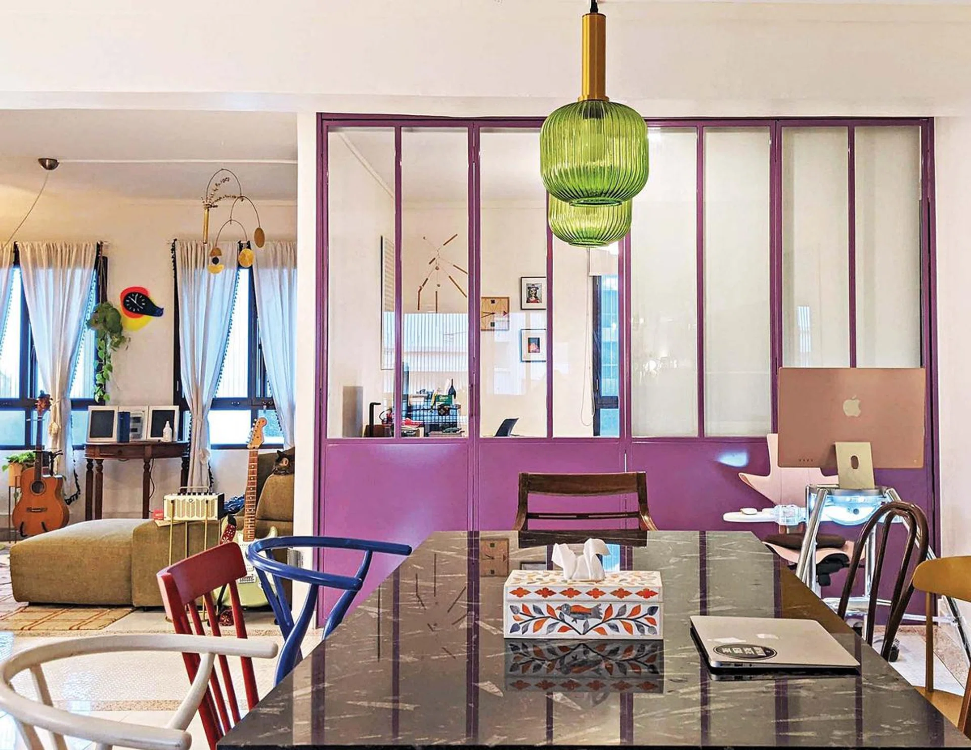 Working together closely over three months before their move in February 2021, they tackled the challenges of overhauling an old flat. They also took their time, even installing the purple metal partition for their study a year and a half after moving in.