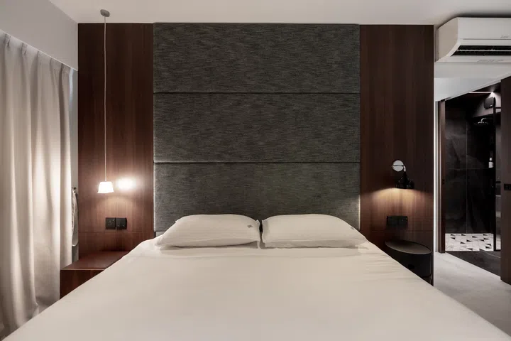 The full length bedhead and laminated wall cladding allowed the room to feel luxurious and grand, along with the cozy lightings installed to give off a five star staycation ambience.