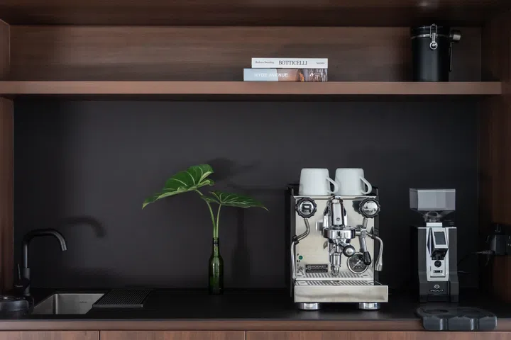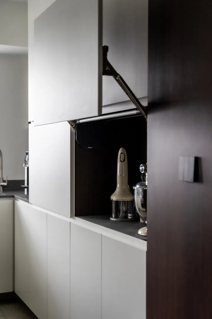 “As we prefer a neat kitchen, we have to cater for plenty of storage space for appliances such as rice cooker, air fryer, mixer and all our baking stuff”, Zach explained. He also opted for an integrated refrigerator and concealed the washing machine to maintain the overall seamless look.