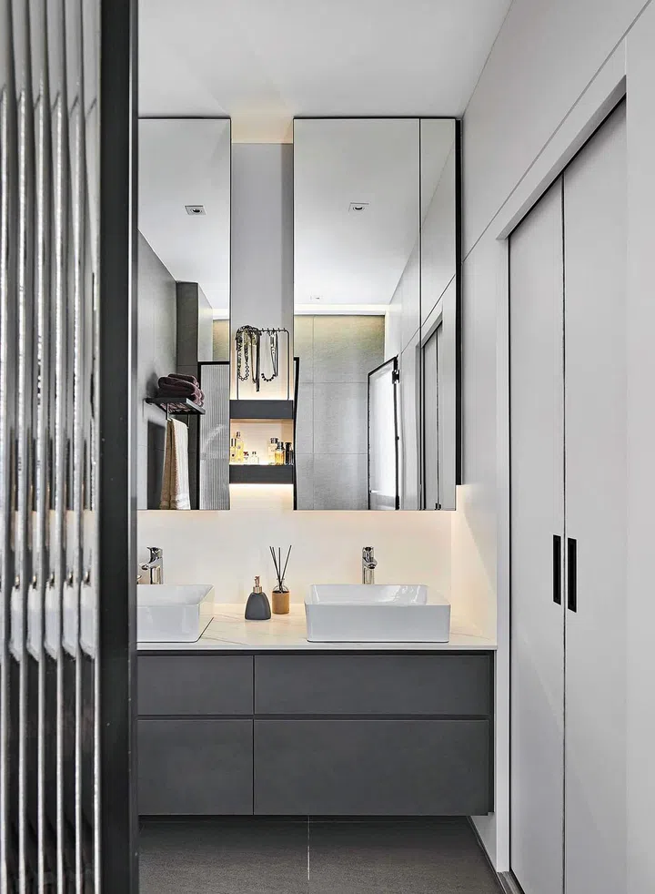 Note the vertical lines via the reeded glass panel in the master bathroom, a design feature that echoes the vertical grilles at the staircase and fluted wall panels.