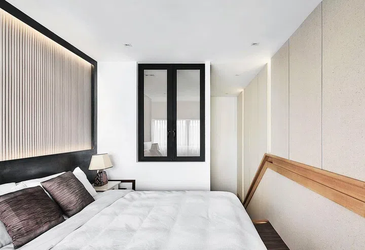 Tucking the bathroom away behind the bedroom feature wall promotes better sleep by keeping noise away from the wet area.