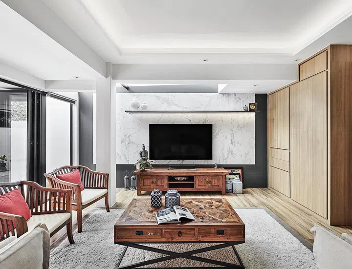 Stone surfaces provide visual texture and a touch of luxury. Among them are terrazzo tiles at the entrance, large slab tiles on the television feature wall, and a porcelain kitchen countertop.