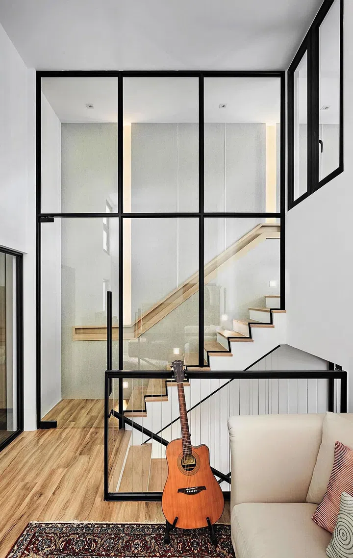 The full-height series of black-framed glass panels, entrance to the master bedroom upstairs, and internal windows let natural light into the space.