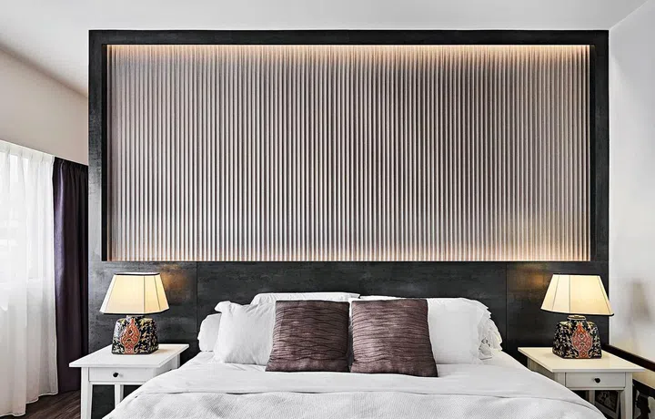 Lighting adds depth to the fluted wall panel and draws attention to the symmetry here.