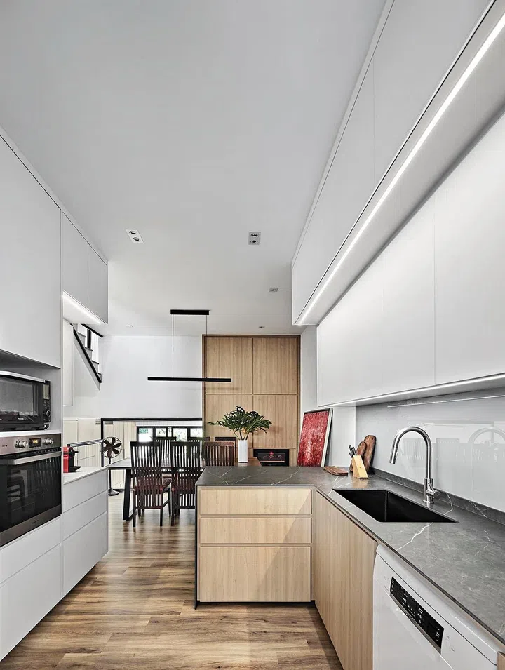 "Everything was stripped bare so that we could make the massive changes possible," says Jinhai, adding that the couple wanted brighter living spaces. "The split levels on the first floor presented the biggest challenge, constraining the kitchen and dining space."