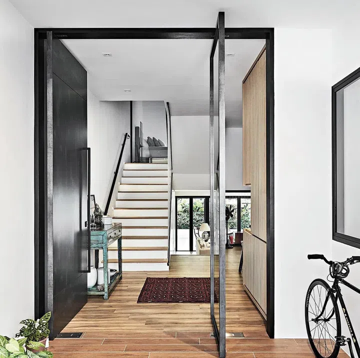 Cleaning out the dated surface materials and furnishings, Jinhai and his team installed a 2.8 metre pivot door as a striking entrance to the home.