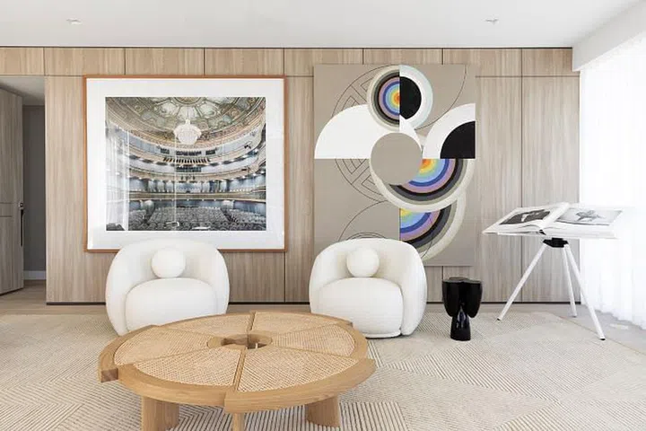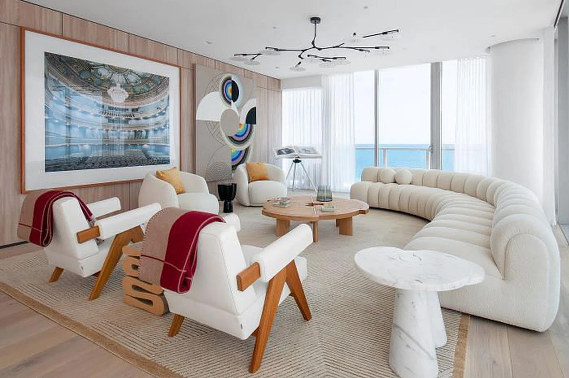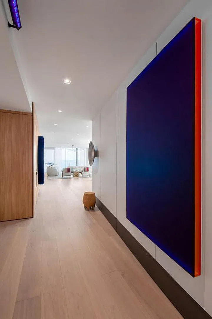 Elevating the overall look of this marine vista condominium came by way of a careful selection of sculptural pieces, furniture and lighting fixtures by Studio Oliver Gustav, Michael Anastassiades, Pierre Yovanovitch and Patricia Urquiola, among many others. These dialogue with artworks by Victor Vasarely, Jose Dávila, Claudia Wieser, Niyoko Ikuta and Sara Genn, to name only a few of the artists that grace the spaces of this designer beach house interior.